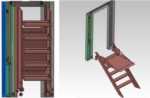 Localizada dentro do baú do veículo, a plataforma elevatória auxilia na subida e descida da cadeira de rodas com acionamento via cilindro hidráulico. Sistemas adicionais de segurança são previstos, visando reduzir ao máximo risco de acidentes. Construída de forma a incorporar a escada e a plataforma elevatória em um mesmo espaço, maximizando o espaço interno do baú. A figura abaixo ilustra vista parcial da escada indicando a ideia de desenvolvimento do projeto.